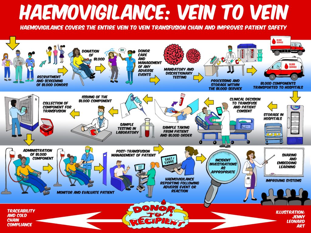 A graphic from SHOT that shows the importance of haemovigilance, which is a set of surveillance procedures covering the entire transfusion chain, from the donation and processing of blood and its components, to their provision and transfusion to patients and their follow-up.